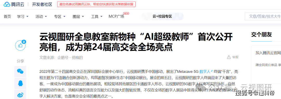 新一代全息教室的核心优势,在于其对AI超级数字老师的完美承载。这款AI超级数字老师并非简单的虚拟形象,而是云视图研历经多年技术沉淀的成果—— 从 2019年发布全球首个1:1全息虚拟人“千云”,到 2022年联合中国移动推出基于5G云部署的技术方案,再到2023年在重庆高教博览会上完成全息教学系统接入示范,其技术成熟度已得到专业领域的广泛认可。
