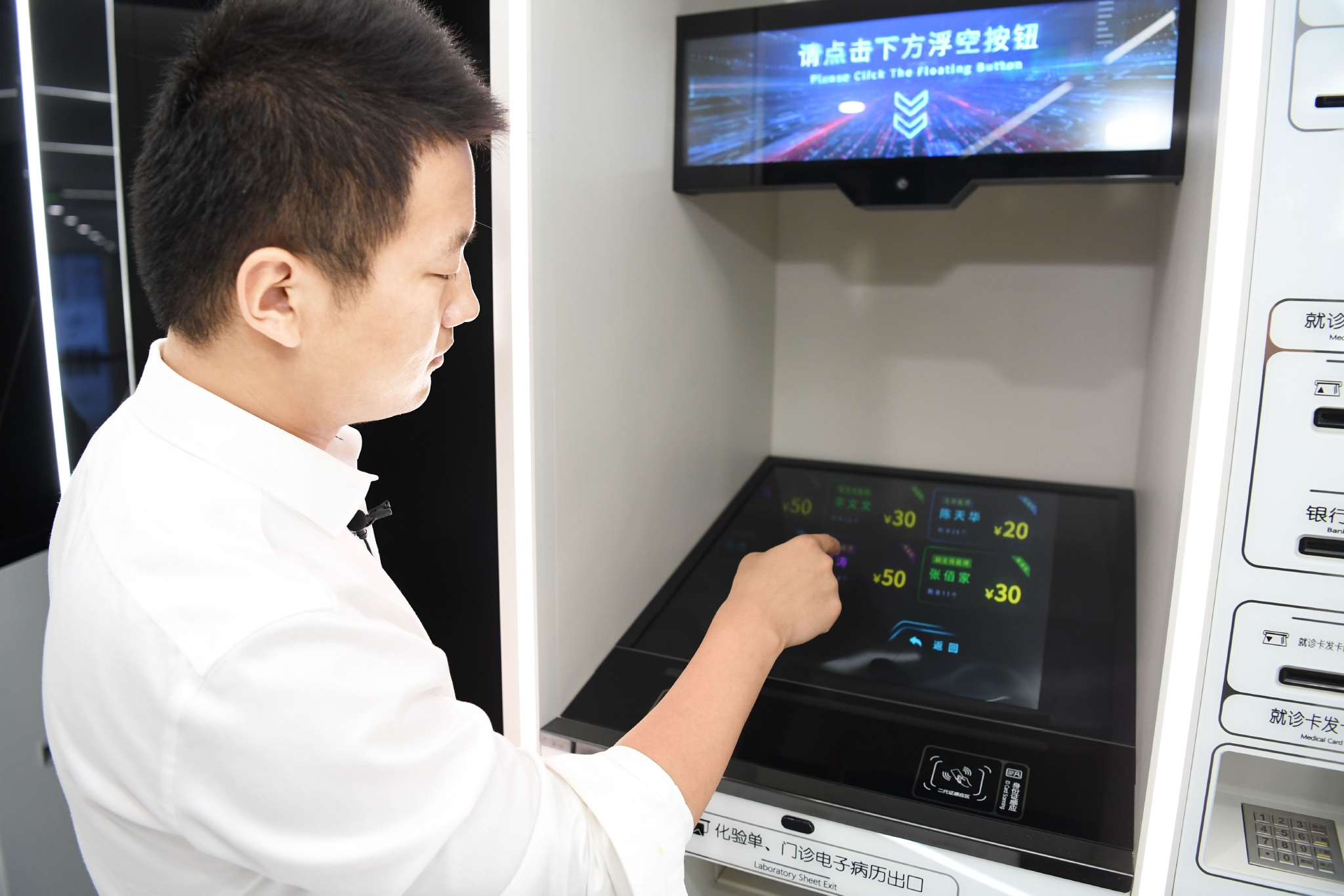 这让两人感到兴奋,他们把核心员工召集到医院,晚上带上工具箱,吃住在这里。“当时医院给了我们两台自助挂号机设备,第二天早上我们就把传统的自助挂号机改造成了集成空中成像技术的非接触式自助挂号机。”他们把传统显示屏取下,在设备内部镶上空中显示模块,影像悬浮在空中。